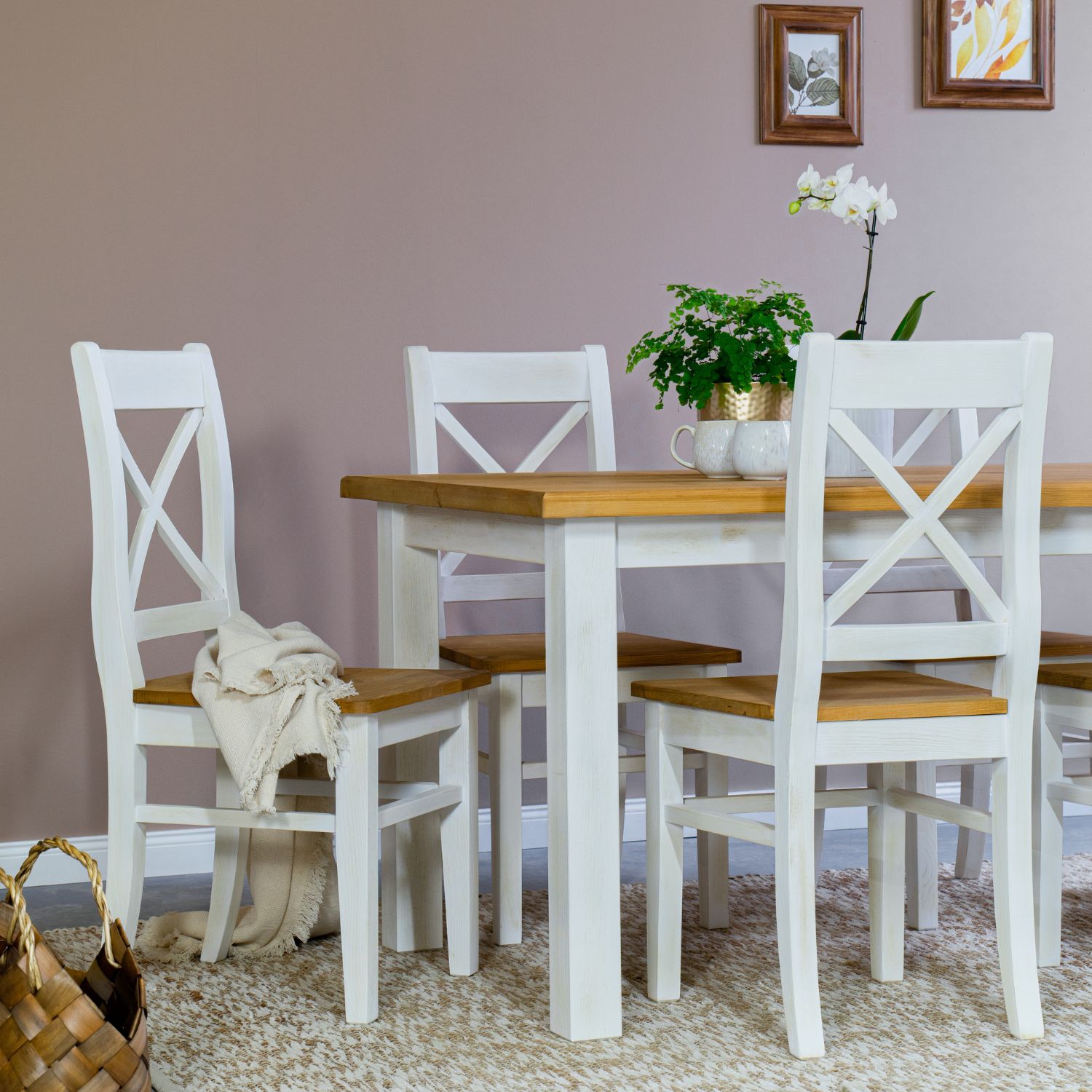 - Krzesła drewniane malowane na biało – klasyczne i ponadczasowe, idealne do jadalni i kuchni.